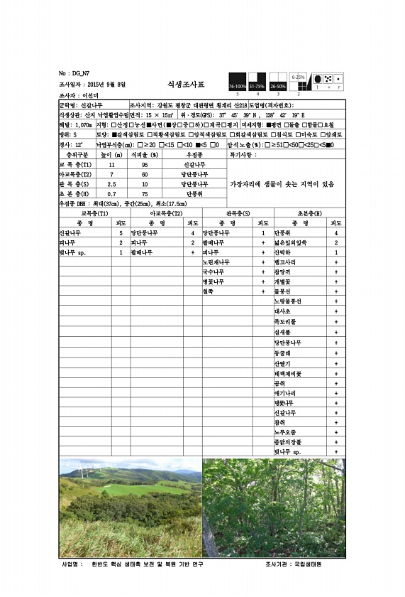 97 No DG_N7 조사일자 2015년 9월 8일 조사자 이선미 식생조사표 군락명신갈나무 조사지역강원도 평창군 대관령면 횡계리 산218 도엽명 격자번호 식생상관산지 낙엽활엽수림면적15 × 15㎡ 위·경도 GPS 37° 45′ 39″N , 128° 42′ 19″E 해발1,070m 지형□산정□능선■사면 ■상□중□하 □계곡□평지 미세지형■평면 □돌출 □함몰□요철 방위S 토양■갈색삼림토 □적황색삼림토 □암적색삼림토 □회갈색삼림토 □침식토 □미숙토 □암쇄토 경사12° 낙엽부식층 cm □≥20 □ 15 □ 10 ■ 5 □0 암석노 출 % □≥51□ 50□ 25□ 5■0 층위구분 높이 m 식피율 % 우점종 특기사항 교 목 층 T1 11 95 신갈나무 가장자리에 샘물이 솟는 지역이 있음 아교목층 T2 7 60 당단풍나무...