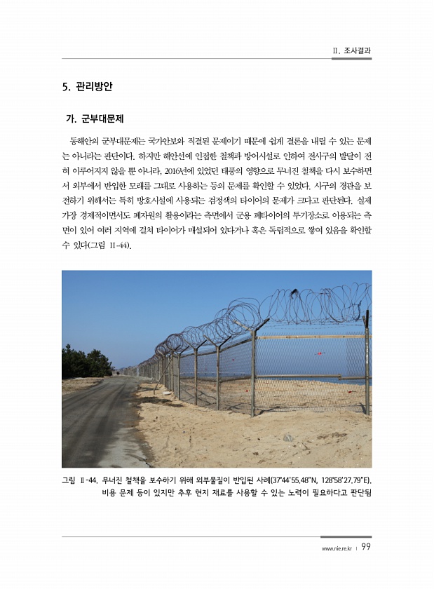 Ⅱ. 조사결과 www.nie.re.kr ? 99 5. 관리방안 가. 군부대문제 동해안의 군부대문제는 국가안보와 직결된 문제이기 때문에 쉽게 결론을 내릴 수 있는 문제 는 아니라는 판단이다. 하지만 해안선에 인접한 철책과 방어시설로 인하여 전사구의 발달이 전 혀 이루어지지 않을 뿐 아니라, 2016년에 있었던 태풍의 영향으로 무너진 철책을 다시 보수하면 서 외부에서 반입한 모래를 그대로 사용하는 등의 문제를 확인할 수 있었다. 사구의 경관을 보 전하기 위해서는 특히 방호시설에 사용되는 검정색의 타이어의 문제가 크다고 판단된다. 실제 가장 경제적이면서도 폐자원의 활용이라는 측면에서 군용 폐타이어의 투기장소로 이용되는 측 면이 있어 여러 지역에 걸쳐 타이어가 매설되어 있다거나 혹은 독립적으로 쌓여 있음을 확인할 ...