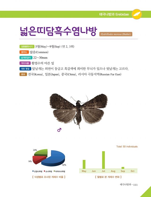 태극나방과?111 태극나방과 Erebidae 성충출현시기 5월 May 9월 Sep 연 2, 3회 풍부도 많음 Common 날개편길이 2230mm 먹이식물 활엽수의 마른 잎 대표 형질 앞날개는 외연이 둥글고 흑갈색에 희미한 무늬가 있으나 뒷날개는 고르다. 분포 전국 Korea , 일본 Japan , 중국 China , 러시아 극동지역 Russian Far East 넓은띠담흑수염나방 Hydrillodes morosa Butler 【 식생별로 조사된 개체수 비율 】 24% 신갈나무림 소나무림 아까시나무림 14% 62% 【 월별로 본 개체수 변화 】 Total50 individuals May Jun Jul Aug SepOct