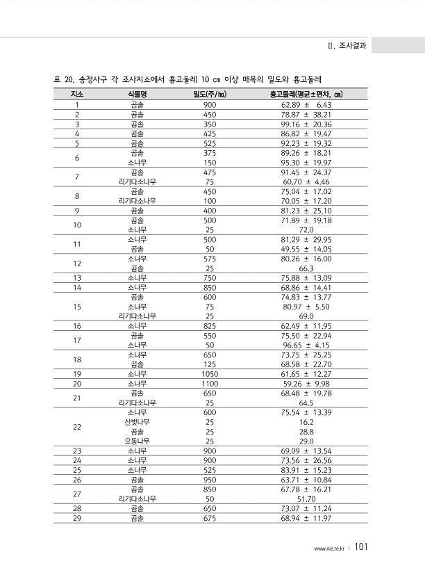 Ⅱ. 조사결과 www.nie.re.kr ? 101 표 20. 송정사구 각 조사지소에서 흉고둘레 10 ㎝ 이상 매목의 밀도와 흉고둘레 지소 식물명 밀도 주/㏊ 흉고둘레 평균±편차, ㎝ 1 곰솔 900 62.89 ± 6.43 2 곰솔 450 78.87 ± 38.21 3 곰솔 350 99.16 ± 20.36 4 곰솔 425 86.82 ± 19.47 5 곰솔 525 92.23 ± 19.32 6 곰솔 375 89.26 ± 18.21 소나무 150 95.30 ± 19.97 7 곰솔 475 91.45 ± 24.37 리기다소나무 75 60.70 ± 4.46 8 곰솔 450 75.04 ± 17.02 리기다소나무 100 70.05 ± 17.20 9 곰솔 400 81.23 ± 25.10 10 곰솔 500 71.89 ± 19.1...