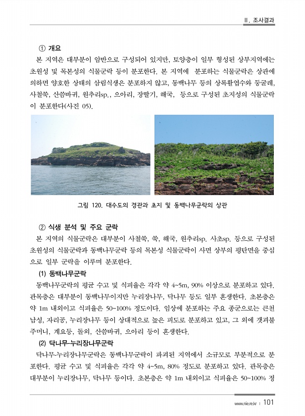 Ⅱ. 조사결과 www.nie.re.kr ? 101 ① 개요 본 지역은 대부분이 암반으로 구성되어 있지만, 토양층이 일부 형성된 상부지역에는 초원성 및 목본성의 식물군락 등이 분포한다. 본 지역에 분포하는 식물군락은 상관에 의하면 양호한 상태의 삼림식생은 분포하지 않고, 동백나무 등의 상록활엽수와 둥굴레, 사철쑥, 산씀바귀, 원추리sp., 으아리, 장딸기, 해국, 등으로 구성된 초지성의 식물군락 이 분포한다 사진 05 그림 120. 대수도의 경관과 초지 및 동백나무군락의 상관 ② 식생 분석 및 주요 군락 본 지역의 식물군락은 대부분이 사철쑥, 쑥, 해국, 원추리sp. 사초sp. 등으로 구성된 초원성의 식물군락과 동백나무군락 등의 목본성 식물군락이 사면 상부의 평탄면을 중심 으로 일부 군락을 이루며 분포한다. ...