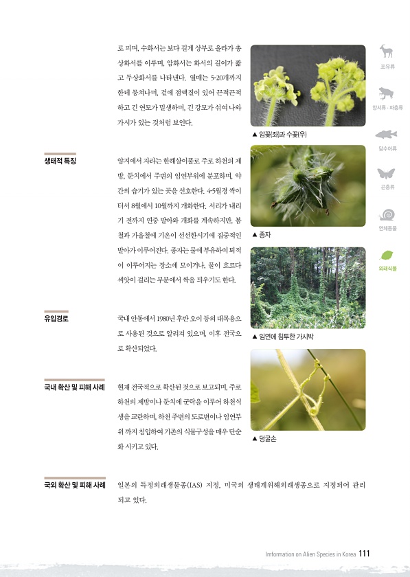 포유류 양서류 · 파충류 담수어류 곤충류 연체동물 외래식물 Imformation on Alien Species in Korea 111 로 피며, 수화서는 보다 길게 상부로 올라가 총 상화서를 이루며, 암화서는 화서의 길이가 짧 고 두상화서를 나타낸다. 열매는 5-20개까지 한데 뭉쳐나며, 겉에 점액질이 있어 끈적끈적 하고 긴 연모가 밀생하며, 긴 강모가 섞여 나와 가시가 있는 것처럼 보인다. 생태적 특징 양지에서 자라는 한해살이풀로 주로 하천의 제 방, 둔치에서 주변의 임연부위에 분포하며, 약 간의 습기가 있는 곳을 선호한다. 4-5월경 싹이 터서 8월에서 10월까지 개화한다. 서리가 내리 기 전까지 연중 발아와 개화를 계속하지만, 봄 철과 가을철에 기온이 선선한시기에 집중적인 발아가 이루어진다. 종자는 물...