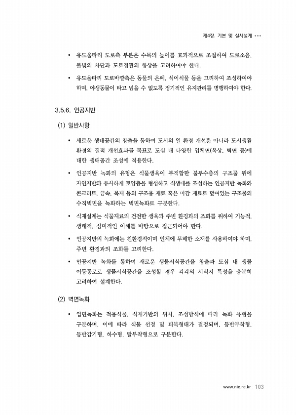 www.nie.re.kr 103 제4장. 기본 및 실시설계 유도울타리 도로측 부분은 수목의 높이를 효과적으로 조절하여 도로소음, 불빛의 차단과 도로경관의 향상을 고려하여야 한다. 유도울타리 도로바깥측은 동물의 은폐, 식이식물 등을 고려하여 조성하여야 하며, 야생동물이 타고 넘을 수 없도록 정기적인 유지관리를 병행하여야 한다. 3.5.6. 인공지반 1 일반사항 새로운 생태공간의 창출을 통하여 도시의 열 환경 개선뿐 아니라 도시생활 환경의 질적 개선효과를 목표로 도심 내 다양한 입체면 옥상, 벽면 등 에 대한 생태공간 조성에 적용한다. 인공지반 녹화의 유형은 식물생육이 부적합한 불투수층의 구조물 위에 자연지반과 유사하게 토양층을 형성하고 식생대를 조성하는 인공지반 녹화와 콘크리트, 금속, 목재 등의 구조용 재료...