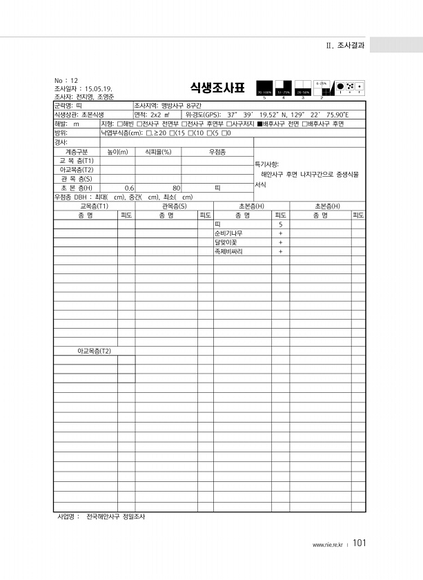 Ⅱ. 조사결과 www.nie.re.kr ? 101 No 12 조사일자 15.05.19. 조사자전지영, 조영준 식생조사표 군락명띠 조사지역맹방사구 8구간 식생상관초본식생 면적2x2 ㎡ 위?경도 GPS 37° 39′ 19.52″N, 129° 22′ 75.90E 해발m 지형□해빈 □전사구 전면부 □전사구 후면부 □사구저지 ■배후사구 전면 □배후사구 후면 방위낙엽부식층 cm □.≥20 □ 15 □ 10 □ 5 □0 경사계층구분 높이 m 식피율 % 우점종 특기사항해안사구 후면 나지구간으로 중생식물 서식 교 목 층 T1 아교목층 T2 관 목 층 S 초 본 층 H 0.6 80 띠 우점종 DBH 최대 cm , 중간 cm , 최소 cm 교목층 T1 관목층 S 초본층 H 초본층 H 종 명 피도 종 명 피도 종 명 피도 종 명...