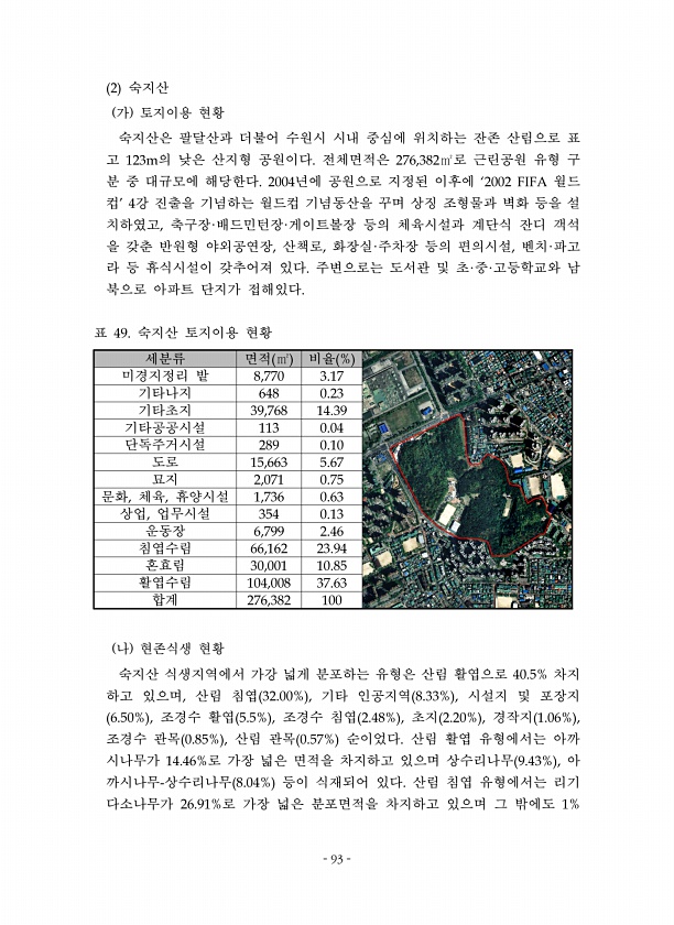 93 숙지산 가 토지이용 현황 숙지산은 팔달산과 더불어 수원시 시내 중심에 위치하는 잔존 산림으로 표 고 의 낮은 산지형 공원이다 전체면적은 로 근린공원 유형 구 분 중 대규모에 해당한다 년에 공원으로 지정된 이후에 월드 컵 강 진출을 기념하는 월드컵 기념동산을 꾸며 상징 조형물과 벽화 등을 설 치하였고 축구장 배드민턴장 게이트볼장 등의 체육시설과 계단식 잔디 객석 을 갖춘 반원형 야외공연장 산책로 화장실 주차장 등의 편의시설 벤치 파고 라 등 휴식시설이 갖추어져 있다 주변으로는 도서관 및 초 중 고등학교와 남 북으로 아파트 단지가 접해있다 세분류 면적 비율 미경지정리 밭 기타나지 기타초지 기타공공시설 단독주거시설 도로 묘지 문화 체육 휴양시설 상업 업무시설 운동장 침엽수림 혼효림 활엽수림 합계 표 숙지산 ...