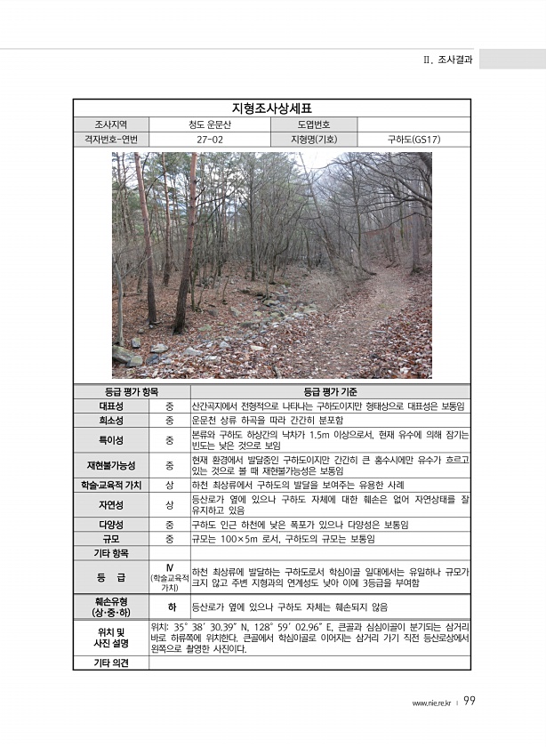 Ⅱ. 조사결과 www.nie.re.kr ? 99 지형조사상세표 조사지역 청도 운문산 도엽번호 격자번호-연번 27-02 지형명 기호 구하도 GS17 등급 평가 항목 등급 평가 기준 대표성 중 산간곡지에서 전형적으로 나타나는 구하도이지만 형태상으로 대표성은 보통임 희소성 중 운문천 상류 하곡을 따라 간간히 분포함 특이성 중 본류와 구하도 하상간의 낙차가 1.5m 이상으로서, 현재 유수에 의해 잠기는 빈도는 낮은 것으로 보임 재현불가능성 중 현재 환경에서 발달중인 구하도이지만 간간히 큰 홍수시에만 유수가 흐르고 있는 것으로 볼 때 재현불가능성은 보통임 학술?교육적 가치 상 하천 최상류에서 구하도의 발달을 보여주는 유용한 사례 자연성 상 등산로가 옆에 있으나 구하도 자체에 대한 훼손은 없어 자연상태를 잘 유지하고 ...
