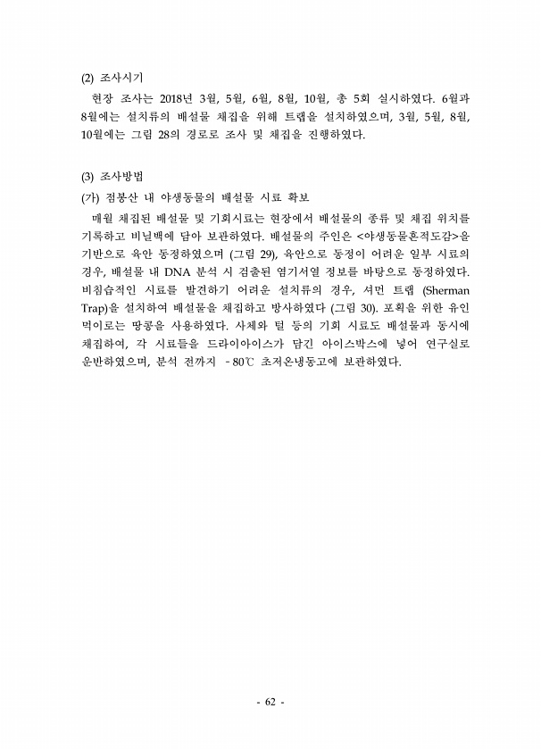62 2 조사시기 현장 조사는 2018년 3월, 5월, 6월, 8월, 10월, 총 5회 실시하였다. 6월과 8월에는 설치류의 배설물 채집을 위해 트랩을 설치하였으며, 3월, 5월, 8월, 10월에는 그림 28의 경로로 조사 및 채집을 진행하였다. 3 조사방법 가 점봉산 내 야생동물의 배설물 시료 확보 매월 채집된 배설물 및 기회시료는 현장에서 배설물의 종류 및 채집 위치를 기록하고 비닐백에 담아 보관하였다. 배설물의 주인은 야생동물흔적도감 을 기반으로 육안 동정하였으며 그림 29 , 육안으로 동정이 어려운 일부 시료의 경우, 배설물 내 DNA 분석 시 검출된 염기서열 정보를 바탕으로 동정하였다. 비침습적인 시료를 발견하기 어려운 설치류의 경우, 셔먼 트랩 Sherman Trap 을 설치하여 배설물을 채집하고...