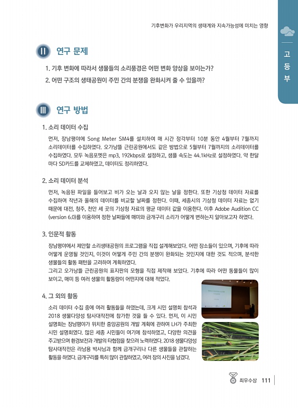 최우수상 111 고 등 부 기후변화가 우리지역의 생태계와 지속가능성에 미치는 영향 Ⅱ 연구 문제 1. 기후 변화에 따라서 생물들의 소리풍경은 어떤 변화 양상을 보이는가? 2. 어떤 구조의 생태공원이 주민 간의 분쟁을 완화시켜 줄 수 있을까? Ⅲ 연구 방법 1. 소리 데이터 수집 먼저, 장남평야에 Song Meter SM4를 설치하여 매 시간 정각부터 10분 동안 4월부터 7월까지 소리데이터를 수집하였다. 오가낭뜰 근린공원에서도 같은 방법으로 5월부터 7월까지의 소리데이터를 수집하였다. 모두 녹음포멧은 mp3, 192kbps로 설정하고, 샘플 속도는 44.1kHz로 설정하였다. 약 한달 마다 SD카드를 교체하였고, 데이터도 정리하였다. 2. 소리 데이터 분석 먼저, 녹음된 파일을 들어보고 비가 오는 날과 오지...