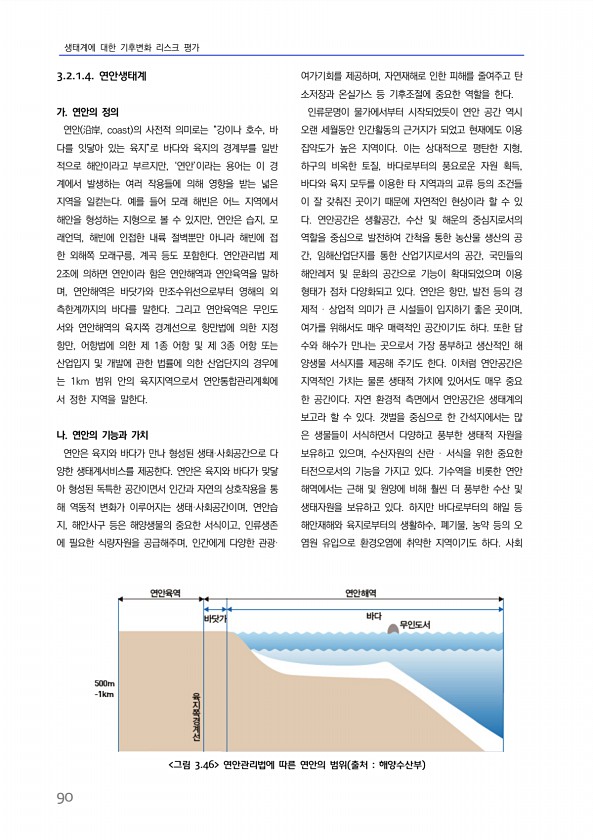 생태계에 대한 기후변화 리스크 평가 90 3.2.1.4. 연안생태계 가. 연안의 정의 연안 沿岸, coast 의 사전적 의미로는 “강이나 호수, 바 다를 잇닿아 있는 육지”로 바다와 육지의 경계부를 일반 적으로 해안이라고 부르지만, ‘연안’이라는 용어는 이 경 계에서 발생하는 여러 작용들에 의해 영향을 받는 넓은 지역을 일컫는다. 예를 들어 모래 해빈은 어느 지역에서 해안을 형성하는 지형으로 볼 수 있지만, 연안은 습지, 모 래언덕, 해빈에 인접한 내륙 절벽뿐만 아니라 해빈에 접 한 외해쪽 모래구릉, 계곡 등도 포함한다. 연안관리법 제 2조에 의하면 연안이라 함은 연안해역과 연안육역을 말하 며, 연안해역은 바닷가와 만조수위선으로부터 영해의 외 측한계까지의 바다를 말한다. 그리고 연안육역은 무인도 서와 연안해...