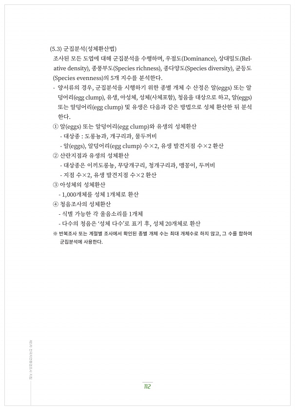 112 제5차 전국자연환경조사 지침 ?.? 군집분석 성체환산법 조사된?모든?도엽에?대해?군집분석을?수행하며, 우점도 Dominance , 상대밀도 Relative density , 종풍부도 Species richness , 종다양도 Species diversity , 균등도 Species evenness 의 ?개?지수를?분석한다. 양서류의?경우, 군집분석을?시행하기?위한?종별?개체?수?산정은?알 eggs 또는?알 덩어리 egg clump , 유생, 아성체, 성체 사체포함 , 청음을?대상으로?하고, 알 eggs 또는?알덩어리 egg clump 및?유생은?다음과?같은?방법으로?성체?환산한?뒤?분석 한다. ① 알 eggs 또는?알덩어리 egg clump 와?유생의?성체환산 대상종 도롱뇽과, 개구리과, 물두꺼비 알...