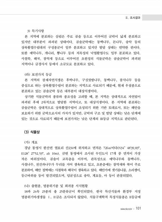 Ⅱ. 조사결과 www.nie.re.kr ? 101 3 특기사항 본 지역에 분포하는 삼림은 주로 곰솔 등으로 이루어진 군락이 넓게 분포하고 있지만 대부분이 파괴된 상태이다. 곰솔군락에는 동백나무, 돈나무, 송악 등의 상록활엽수림대의 구성종군이 일부 분포하고 있지만 발달 상태는 빈약한 편이다. 또한 예덕나무, 개나리, 뽕나무 등의 저목성의 낙엽활엽수도 일부 분포하고 있다. 사철쑥, 해국, 참억새 등으로 이루어진 초원성의 식물군락은 곰솔군락이 파괴된 지역이나 급경사지 등에서 소규모로 분포하고 있다. 라 보전가치 등급 본 지역의 잠재자연식생은 후박나무, 구실잣밤나무, 동백나무, 참식나무 등을 중심으로 하는 상록활엽수림이 분포하는 지역으로 사료되기 때문에, 현재 우점종으로 분포하고 있는 곰솔군락 등은 대부분이 대상식...