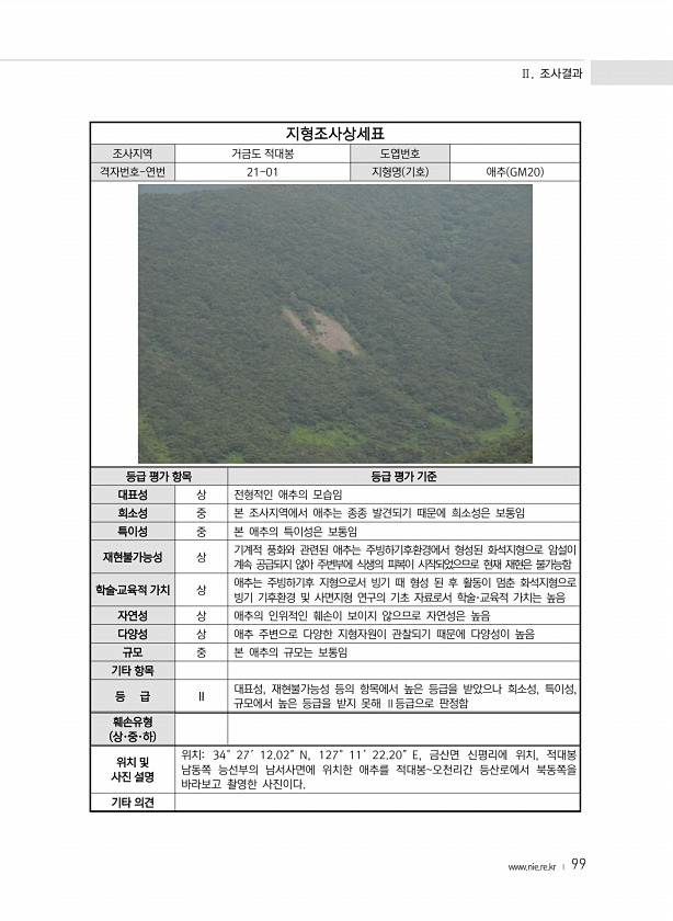 Ⅱ. 조사결과 www.nie.re.kr ? 99 지형조사상세표 조사지역 거금도 적대봉 도엽번호 격자번호-연번 21-01 지형명 기호 애추 GM20 등급 평가 항목 등급 평가 기준 대표성 상 전형적인 애추의 모습임 희소성 중 본 조사지역에서 애추는 종종 발견되기 때문에 희소성은 보통임 특이성 중 본 애추의 특이성은 보통임 재현불가능성 상 기계적 풍화와 관련된 애추는 주빙하기후환경에서 형성된 화석지형으로 암설이 계속 공급되지 않아 주변부에 식생의 피복이 시작되었으므로 현재 재현은 불가능함 학술?교육적 가치 상 애추는 주빙하기후 지형으로서 빙기 때 형성 된 후 활동이 멈춘 화석지형으로 빙기 기후환경 및 사면지형 연구의 기초 자료로서 학술·교육적 가치는 높음 자연성 상 애추의 인위적인 훼손이 보이지 않으므로 자연성...