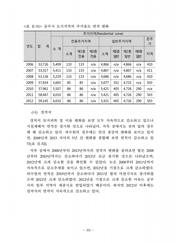 89 연도 합 계 주거지역 Residential zone 소 계 전용주거지역 일반주거지역 준주 거 소계 제1종 전용 제2종 전용 소계 제일반 1종 제일반 2종 제일반 3종 지역 2006 53,726 5,409 133 133 n/a 4,866 n/a 4,866 n/a 410 2007 53,317 5,411 133 133 n/a 4,867 n/a 4,867 n/a 411 2008 53,136 5,229 133 133 n/a 4,686 n/a 4,686 n/a 410 2009 57,654 5,665 85 85 n/a 5,077 352 4,725 n/a 503 2010 57,961 5,507 86 86 n/a 5,421 405 4,726 290 n/a 2011 58,467 6,010 86 86 n/a 5,421 4...