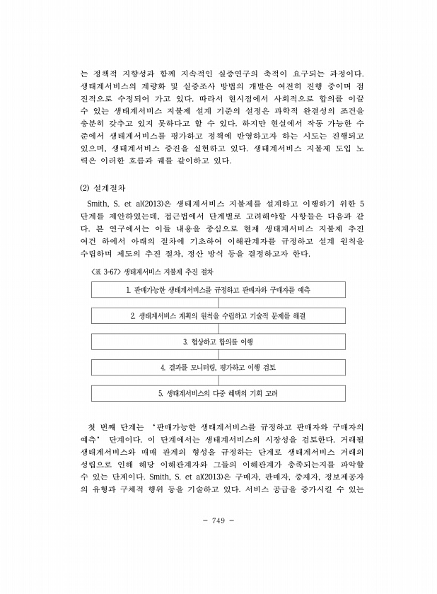 749 는 정책적 지향성과 함께 지속적인 실증연구의 축적이 요구되는 과정이다. 생태계서비스의 계량화 및 실증조사 방법의 개발은 여전히 진행 중이며 점 진적으로 수정되어 가고 있다. 따라서 현시점에서 사회적으로 합의를 이끌 수 있는 생태계서비스 지불제 설계 기준의 설정은 과학적 완결성의 조건을 충분히 갖추고 있지 못하다고 할 수 있다. 하지만 현실에서 작동 가능한 수 준에서 생태계서비스를 평가하고 정책에 반영하고자 하는 시도는 진행되고 있으며, 생태계서비스 증진을 실현하고 있다. 생태계서비스 지불제 도입 노 력은 이러한 흐름과 궤를 같이하고 있다. 2 설계절차 Smith, S. et al 2013 은 생태계서비스 지불제를 설계하고 이행하기 위한 5 단계를 제안하였는데, 접근법에서 단계별로 고려해야할 사항들은 ...
