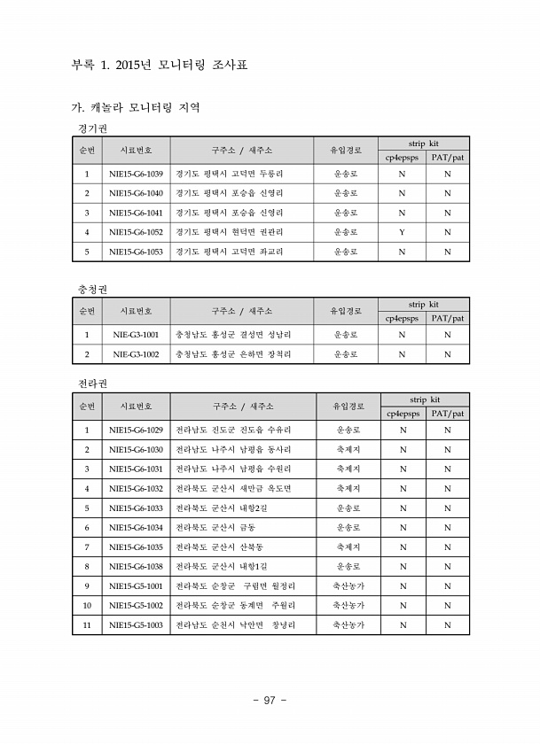 경기권 순번 시료번호 구주소 새주소 유입경로 strip kit cp4epsps PAT/pat 1 NIE15-G6-1039 경기도 평택시 고덕면 두릉리 운송로 N N 2 NIE15-G6-1040 경기도 평택시 포승읍 신영리 운송로 N N 3 NIE15-G6-1041 경기도 평택시 포승읍 신영리 운송로 N N 4 NIE15-G6-1052 경기도 평택시 현덕면 권관리 운송로 Y N 5 NIE15-G6-1053 경기도 평택시 고덕면 좌교리 운송로 N N 전라권 순번 시료번호 구주소 새주소 유입경로 strip kit cp4epsps PAT/pat 1 NIE15-G6-1029 전라남도 진도군 진도읍 수유리 운송로 N N 2 NIE15-G6-1030 전라남도 나주시 남평읍 동사리 축제지 N N 3 NIE15-G6-103...