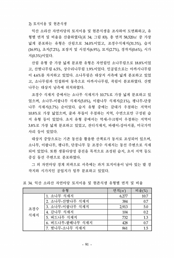 유형 면적 ㎡ 비율 % 조경수 식재지 1. 소나무 식재지 6,277 10.7 2. 소나무-산딸나무 식재지 384 0.7 3. 소나무-이팝나무 식재지 2,913 5.0 4. 감나무 식재지 104 0.2 5. 버드나무 식재지 732 1.3 6. 버드나무-팥배나무 식재지 428 0.7 7. 벚나무-소나무 식재지 861 1.5 표 34. 익산 소라산 자연마당 토지이용 및 현존식생 유형별 면적 및 비율 2 토지이용 및 현존식생 익산 소라산 자연마당의 토지이용 및 현존식생을 조사하여 도면화하고, 유 형별 면적 및 비율을 산출하였다 표 34; 그림 83 총 면적 58,520㎡ 중 가장 넓게 분포하는 유형은 산림으로 34.0%이었고, 조경수식재지 31.3% , 습지 16.9% , 초지 7.2% , 포장지 및 시설지 6.9...