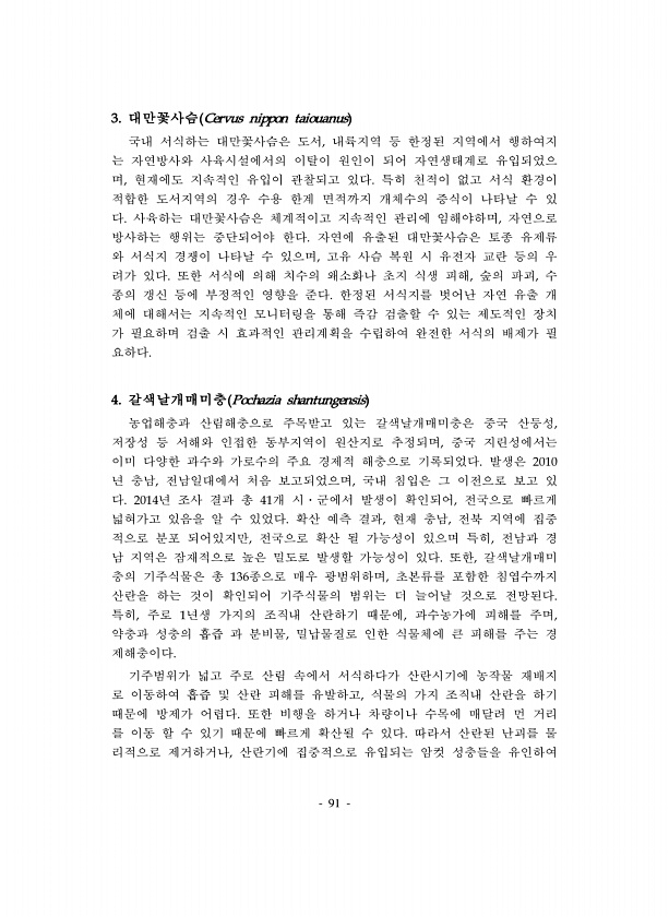 91 3. 대만꽃사슴 Cervus nippon taiouanus 국내 서식하는 대만꽃사슴은 도서, 내륙지역 등 한정된 지역에서 행하여지 는 자연방사와 사육시설에서의 이탈이 원인이 되어 자연생태계로 유입되었으 며, 현재에도 지속적인 유입이 관찰되고 있다. 특히 천적이 없고 서식 환경이 적합한 도서지역의 경우 수용 한계 면적까지 개체수의 증식이 나타날 수 있 다. 사육하는 대만꽃사슴은 체계적이고 지속적인 관리에 임해야하며, 자연으로 방사하는 행위는 중단되어야 한다. 자연에 유출된 대만꽃사슴은 토종 유제류 와 서식지 경쟁이 나타날 수 있으며, 고유 사슴 복원 시 유전자 교란 등의 우 려가 있다. 또한 서식에 의해 치수의 왜소화나 초지 식생 피해, 숲의 파괴, 수 종의 갱신 등에 부정적인 영향을 준다. 한정된 서식...