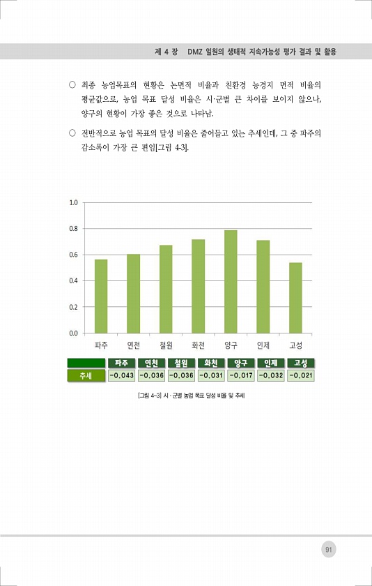 91 제 4 장 DMZ 일원의 생태적 지속가능성 평가 결과 및 활용 ○ 최종 농업목표의 현황은 논면적 비율과 친환경 농경지 면적 비율의 평균값으로, 농업 목표 달성 비율은 시·군별 큰 차이를 보이지 않으나, 양구의 현황이 가장 좋은 것으로 나타남. ○ 전반적으로 농업 목표의 달성 비율은 줄어들고 있는 추세인데, 그 중 파주의 감소폭이 가장 큰 편임[그림 4-3]. [그림 4-3] 시·군별 농업 목표 달성 비율 및추세