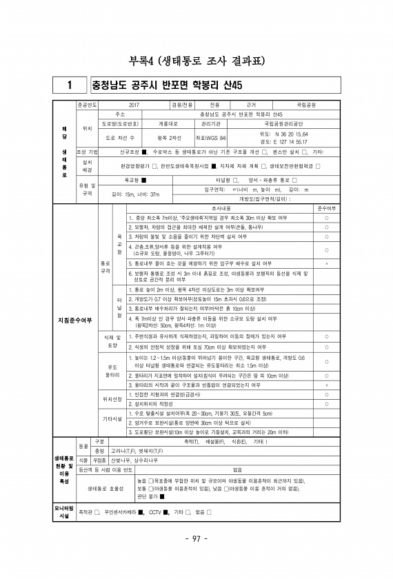 97 부록4 생태통로 조사 결과표 1 충청남도 공주시 반포면 학봉리 산45 해 당 생 태 통 로 준공연도 2017 겸용/전용 전용 근거 국립공원 위치 주소 충청남도 공주시 반포면 학봉리 산45 도로명 도로번호 계룡대로 관리기관 국립공원관리공단 도로 차선 수 왕복 2차선 좌표 WGS 84 위도N 36 20 15..64 경도E 127 14 55.17 조성 기법 신규조성 ■, 수로박스 등 생태통로가 아닌 기존 구조물 개선 □, 펜스만 설치 □, 기타설치 배경 환경영향평가 □, 한반도생태축복원사업 ■, 지자체 자체 계획 □, 생태보전반환협력금 □ 유형 및 규격 육교형 ■ 터널형 □, 양서?파충류 통로 □ 길이15m, 너비37m 입구면적㎡ 너비 m, 높이 m , 길이m 개방도 입구면적/길이 지침준수여부 통로 규격 육...