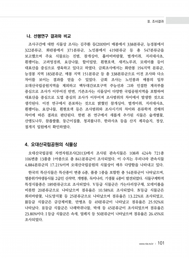 Ⅱ. 조사결과 www.nie.re.kr ? 101 나. 선행연구 결과와 비교 조사구간에 대한 식물상 조사는 김주환 등 2009 이 매봉에서 338분류군, 능경봉에서 322분류군, 화란봉에서 371분류군, 노인봉에서 419분류군 등 총 547분류군을 보고했으며 주요 식물로는 진범, 참개싱아, 홀아비바람꽃, 벌개미취, 지리대사초, 흰괭이눈, 고려엉겅퀴, 요강나물, 할미밀망, 흰현호색, 새끼노루귀, 모데미풀 등이 대표산을 중심으로 생육하고 있다고 하였다. 금회조사에서는 화란봉 194지역 분류군, 능경봉 지역 183분류군, 매봉 지역 151분류군 등 총 338분류군으로 이전 조사와 다소 차이를 보이는 결과를 얻을 수 있었다. 금회 조사는 노인봉과 매봉의 일부 오대산국립공원지역을 제외하고 백두대간보호구역 주능선과 그...