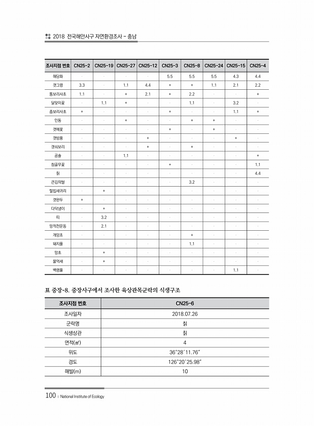 2018 전국해안사구 자연환경조사 충남 100 ? National Institute of Ecology 조사지점 번호 CN25-6 조사일자 2018.07.26 군락명 칡 식생상관 칡 면적 ㎡ 4 위도 36°28′11.76″ 경도 126°20′25.98″ 해발 m 10 표 중장-8. 중장사구에서 조사한 육상관목군락의 식생구조 조사지점 번호 CN25-2 CN25-19 CN25-27 CN25-12 CN25-3 CN25-8 CN25-24 CN25-15 CN25-4 해당화 5.5 5.5 5.5 4.3 4.4 갯그령 3.3 1.1 4.4 + + 1.1 2.1 2.2 통보리사초 1.1 + 2.1 + 2.2 + 달맞이꽃 1.1 + 1.1 3.2 좀보리사초 + + ...