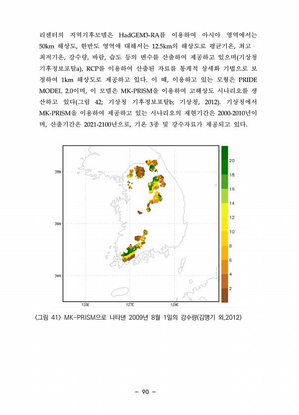 90 리센터의 지역기후모델은 HadGEM3-RA를 이용하여 아시아 영역에서는 50km 해상도, 한반도 영역에 대해서는 12.5km의 해상도로 평균기온, 최고? 최저기온, 강수량, 바람, 습도 등의 변수를 산출하여 제공하고 있으며 기상청 기후정보포탈a , RCP를 이용하여 산출된 자료를 통계적 상세화 기법으로 보 정하여 1km 해상도로 제공하고 있다. 이 때, 이용하고 있는 모형은 PRIDE MODEL 2.0이며, 이 모델은 MK-PRISM을 이용하여 고해상도 시나리오를 생 산하고 있다 그림 42; 기상청 기후정보포탈b; 기상청, 2012 기상청에서 MK-PRISM을 이용하여 제공하고 있는 시나리오의 재현기간은 2000-2010년이 며, 산출기간은 2021-2100년으로, 기온 3종 및 강수자료가 제공되고 있...
