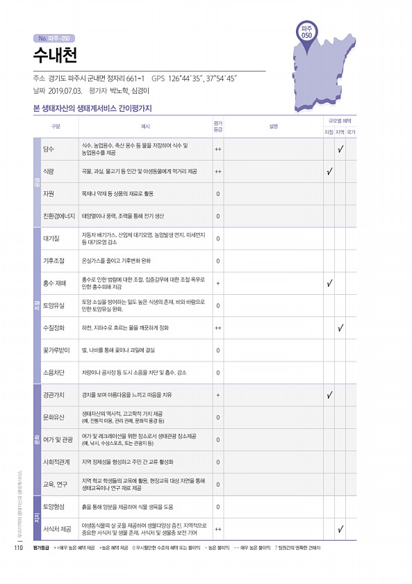 No. 파주- 파주 050 본 생태자산의 생태계서비스 간이평가지 구분 예시 평가 등급 설명 규모별 혜택 지점 지역 국가 공급 담수 식수, 농업용수, 축산 용수 등 물을 저장하여 식수 및 농업용수를 제공 ++ √ 식량 곡물, 과실, 물고기 등 인간 및 야생동물에게 먹거리 제공 ++ √ 자원 목재나 약재 등 상품의 재료로 활용 0 친환경에너지 태양열이나 풍력, 조력을 통해 전기 생산 0 조절 대기질 자동차 배기가스, 산업체 대기오염, 농업발생 먼지, 미세먼지 등 대기오염 감소 0 기후조절 온실가스를 줄이고 기후변화 완화 0 홍수 재해 홍수로 인한 범람에 대한 조절, 집중강우에 대한 조절 폭우로 인한 홍수피해 저감 + √ 토양유실 토양 소실을 방어하는 밀도 높은 식생의 존재, 비와 바람으로 인한 토양유실 완화, ...
