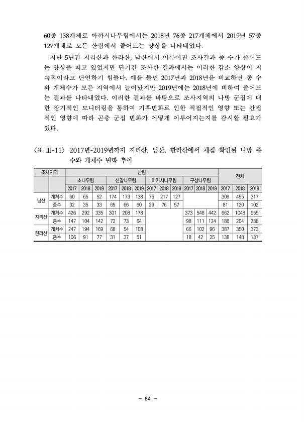 84 60종 138개체로 아까시나무림에서는 2018년 76종 217개체에서 2019년 57종 127개체로 모든 산림에서 줄어드는 양상을 나타내었다. 지난 5년간 지리산과 한라산, 남산에서 이루어진 조사결과 종 수가 줄어드 는 양상을 띠고 있었지만 단기간 조사한 결과에서는 이러한 감소 양상이 지 속적이라고 단언하기 힘들다. 예를 들면 2017년과 2018년을 비교하면 종 수 와 개체수가 모든 지역에서 늘어났지만 2019년에는 2018년에 비하여 줄어드 는 결과를 나타내었다. 이러한 결과를 바탕으로 조사지역의 나방 군집에 대 한 장기적인 모니터링을 통하여 기후변화로 인한 직접적인 영향 또는 간접 적인 영향에 따라 곤충 군집 변화가 어떻게 이루어지는지를 감시할 필요가 있다. 조사지역 산림 전체 소나무림 신갈나무림...