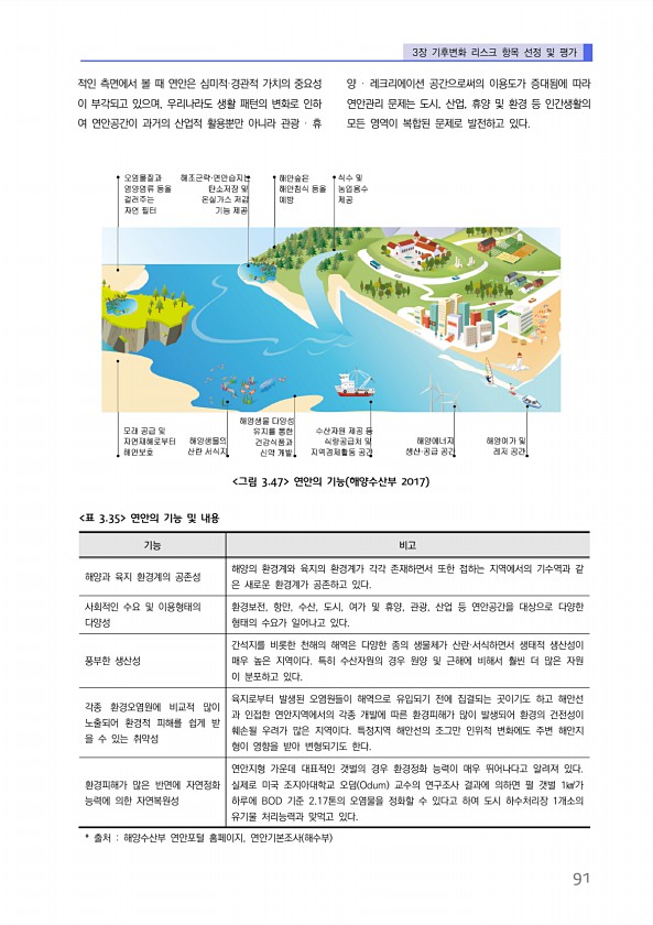 3장 기후변화 리스크 항목 선정 및 평가 91 적인 측면에서 볼 때 연안은 심미적·경관적 가치의 중요성 이 부각되고 있으며, 우리나라도 생활 패턴의 변화로 인하 여 연안공간이 과거의 산업적 활용뿐만 아니라 관광 · 휴 양 · 레크리에이션 공간으로써의 이용도가 증대됨에 따라 연안관리 문제는 도시, 산업, 휴양 및 환경 등 인간생활의 모든 영역이 복합된 문제로 발전하고 있다. 기능 비고 해양과 육지 환경계의 공존성 해양의 환경계와 육지의 환경계가 각각 존재하면서 또한 접하는 지역에서의 기수역과 같 은 새로운 환경계가 공존하고 있다. 사회적인 수요 및 이용형태의 다양성 환경보전, 항만, 수산, 도시, 여가 및 휴양, 관광, 산업 등 연안공간을 대상으로 다양한 형태의 수요가 일어나고 있다. 풍부한 생산성 간석지를 ...