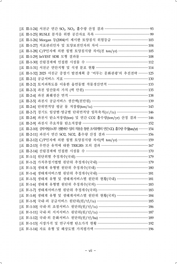 vii [표 Ⅲ-1-24] 서천군 연간 SO2, NO2, 흡수량 산정 결과 ·····················································93 [표 Ⅲ-1-25] RUSLE 분석을 위한 공간자료 목록 ································································99 [표 Ⅲ-1-26] Morgan 등 2004 이 제시한 토양침식 위험등급 ··········································103 [표 Ⅲ-1-27] 지표관리인자 및 토양보전인자의 차이 ·························································104 [표 Ⅲ-1-28] C/P인자에 의한 월별 ...