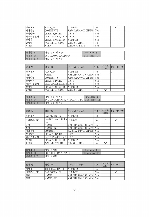 96 랭크 PK RANK_ID NUMBER No O 기타설명 COMMENTS VARCHAR2 2000 CHAR Yes 생성날짜 CREATE_DATE DATE Yes 최종수정날짜 LASTUPDATE_DATE DATE Yes 생성자 CREATE_USER_ID NUMBER Yes 활성화 ACTIVE_STATUS CHAR 1 CHAR No KTSN KTSN CHAR 20 BYTE Yes 테이블 명 택손 랭크 테이블 Database 명 테이블 ID ECOTAXONRANKINFO Tablespace 명 테이블 설명 택손 랭크 테이블 컬럼 명 컬럼 ID Type & Length NULL Default value PK FK IDX 랭크 PK RANK_ID NUMBER No O 이름 NAME VARCHAR2 40 CHAR ...