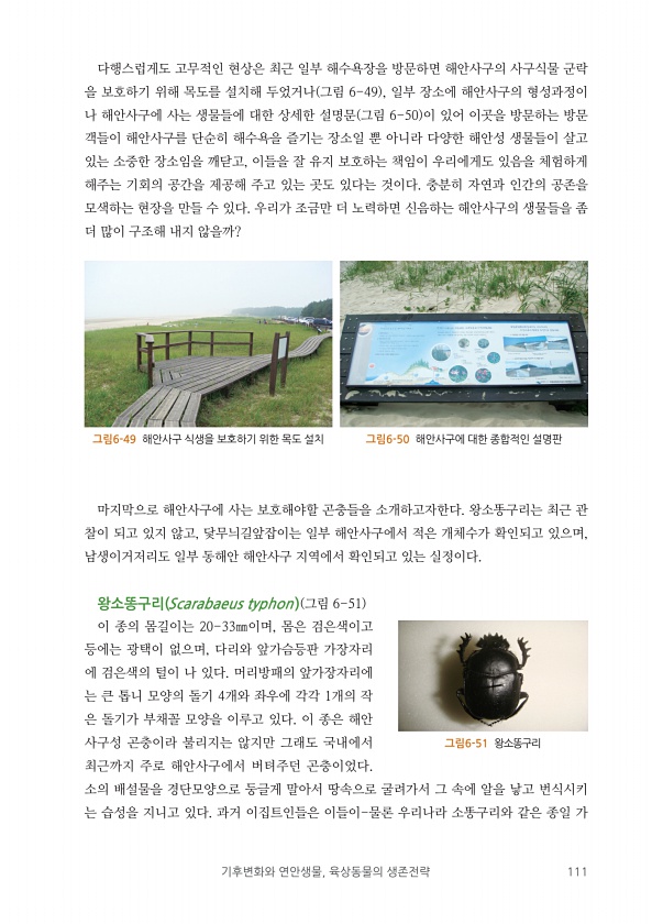 기후변화와 연안생물, 육상동물의 생존전략 111 다행스럽게도 고무적인 현상은 최근 일부 해수욕장을 방문하면 해안사구의 사구식물 군락 을 보호하기 위해 목도를 설치해 두었거나 그림 6-49 , 일부 장소에 해안사구의 형성과정이 나 해안사구에 사는 생물들에 대한 상세한 설명문 그림 6-50 이 있어 이곳을 방문하는 방문 객들이 해안사구를 단순히 해수욕을 즐기는 장소일 뿐 아니라 다양한 해안성 생물들이 살고 있는 소중한 장소임을 깨닫고, 이들을 잘 유지 보호하는 책임이 우리에게도 있음을 체험하게 해주는 기회의 공간을 제공해 주고 있는 곳도 있다는 것이다. 충분히 자연과 인간의 공존을 모색하는 현장을 만들 수 있다. 우리가 조금만 더 노력하면 신음하는 해안사구의 생물들을 좀 더 많이 구조해 내지 않을까? 마지막으로...