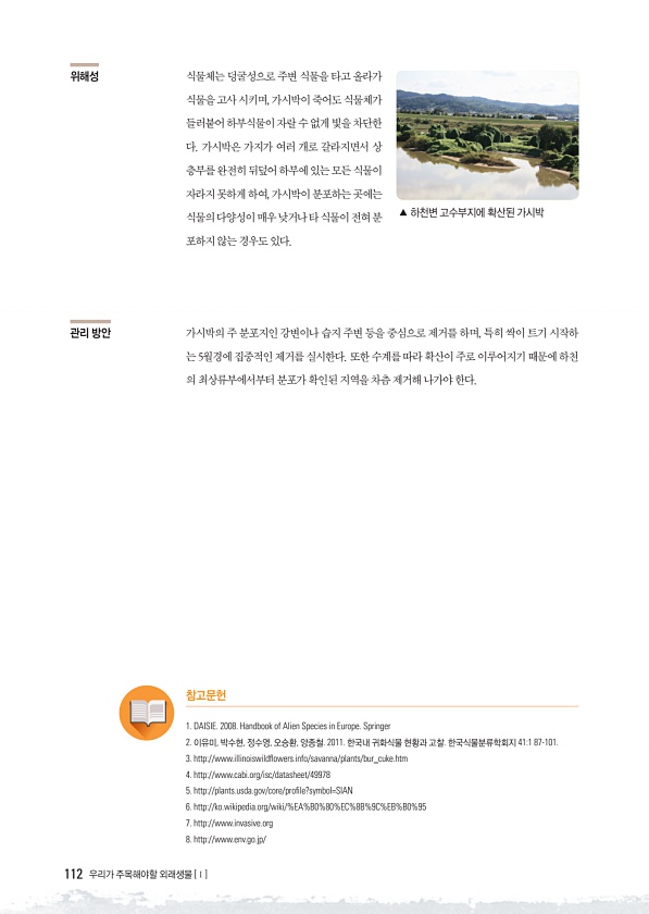 112 우리가 주목해야할 외래생물 [Ⅰ] 참고문헌 1. DAISIE. 2008. Handbook of Alien Species in Europe. Springer 2. 이유미, 박수현, 정수영, 오승환, 양종철. 2011. 한국내 귀화식물 현황과 고찰. 한국식물분류학회지 411 87-101. 3. http//www.illinoiswild owers.info/savanna/plants/bur_cuke.htm 4. http//www.cabi.org/isc/datasheet/49978 5. http//plants.usda.gov/core/pro le?symbol=SIAN 6. http//ko.wikipedia.org/wiki/%EA%B0%80%EC%8B%9C%EB%B0%95 7. http//www.invasive...