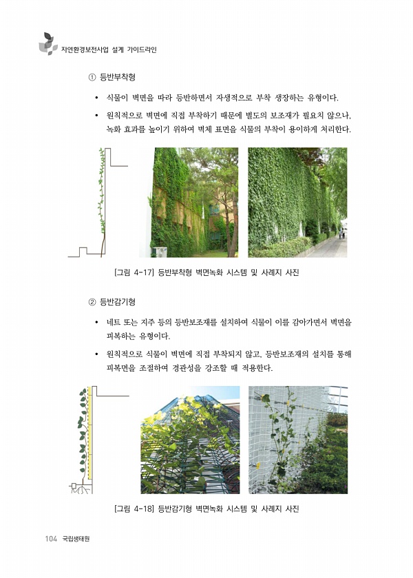 104 국립생태원 자연환경보전사업 설계 가이드라인 ① 등반부착형 식물이 벽면을 따라 등반하면서 자생적으로 부착 생장하는 유형이다. 원칙적으로 벽면에 직접 부착하기 때문에 별도의 보조재가 필요치 않으나, 녹화 효과를 높이기 위하여 벽체 표면을 식물의 부착이 용이하게 처리한다. [그림 4-17] 등반부착형 벽면녹화 시스템 및 사례지 사진 ② 등반감기형 네트 또는 지주 등의 등반보조재를 설치하여 식물이 이를 감아가면서 벽면을 피복하는 유형이다. 원칙적으로 식물이 벽면에 직접 부착되지 않고, 등반보조재의 설치를 통해 피복면을 조절하여 경관성을 강조할 때 적용한다. [그림 4-18] 등반감기형 벽면녹화 시스템 및 사례지사진