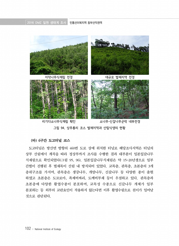 2016 DMZ 일원 생태계 조사 민통선이북지역 동부산악권역 102 ? National Institute of Ecology 자작나무식재림 전경 대규모 벌채지역 전경 리기다소나무식재림 확인 소나무-신갈나무군락 내부전경 그림 94. 상무룡리 코스 벌채지역과 산림식생의 현황 바 6구간 도고터널 코스 도고터널은 방산면 방향의 460번 도로 상에 위치한 터널로 해당조사지역은 터널의 상부 산림에서 계곡을 따라 정상부까지 조사를 수행한 결과 대부분이 일본잎갈나무 식재림으로 확인되었다 그림 95, 96 일본잎갈나무식재림은 약 1520년생으로 일부 간벌이 진행된 후 벌채목이 산림 내 방치되어 있었다. 교목층, 관목층, 초본층의 3개 층위구조를 가지며, 관목층은 생강나무, 개암나무, 신갈나무 등 다양한 종이 출현 하였고 초...