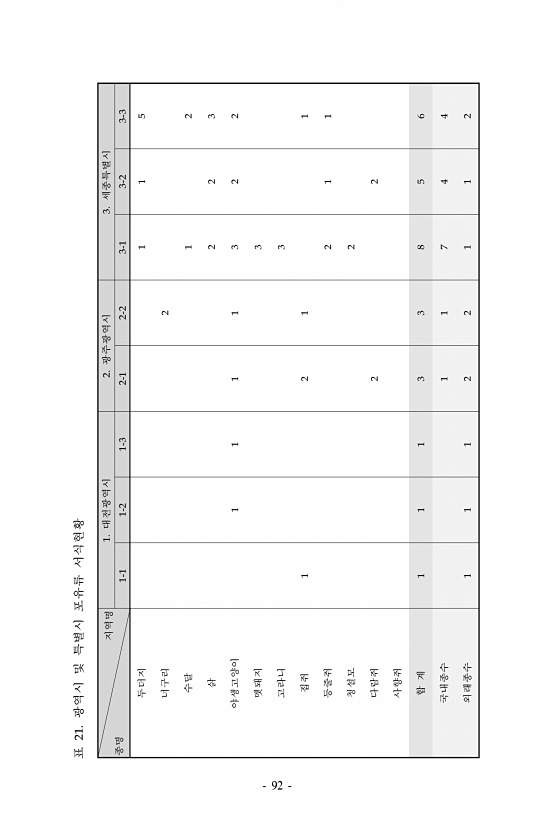 표 21. 광역시 및 특별시 포유류 서식현황 지역명 종명 1. 대전광역시 2. 광주광역시 3. 세종특별시 1-1 1-2 1-3 2-1 2-2 3-1 3-2 3-3 두더지 1 1 5 너구리 2 수달 1 2 삵 2 2 3 야생고양이 1 1 1 1 3 2 2 멧돼지 3 고라니 3 집쥐 1 2 1 1 등줄쥐 2 1 1 청설모 2 다람쥐 2 2 사향쥐 합 계 1 1 1 3 3 8 5 6 국내종수 1 1 7 4 4 외래종수 1 1 1 2 2 1 12