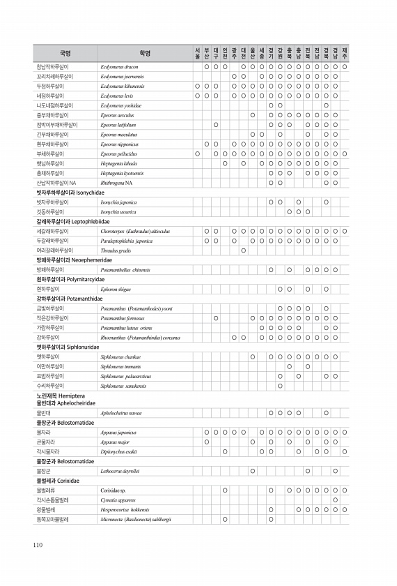 110 참납작하루살이 Ecdyonurus dracon ○ ○ ○ ○ ○ ○ ○ ○ ○ ○ ○ ○ ○ ○ ○ 꼬리치레하루살이 Ecdyonurus joernensis ○ ○ ○ ○ ○ ○ ○ ○ ○ ○ ○ 두점하루살이 Ecdyonurus kibunensis ○ ○ ○ ○ ○ ○ ○ ○ ○ ○ ○ ○ ○ ○ ○ 네점하루살이 Ecdyonurus levis ○ ○ ○ ○ ○ ○ ○ ○ ○ ○ ○ ○ ○ ○ ○ 나도네점하루살이 Ecdyonurus yoshidae ○ ○ ○ 중부채하루살이 Epeorus aesculus ○ ○ ○ ○ ○ ○ ○ ○ ○ 점박이부채하루살이 Epeorus latifolium ○ ○ ○ ○ ○ ○ ○ ○ 긴부채하루살이 Epeorus maculatus ○ ○ ○ ○ ○ ○ 흰부채하루살이 Epeor...