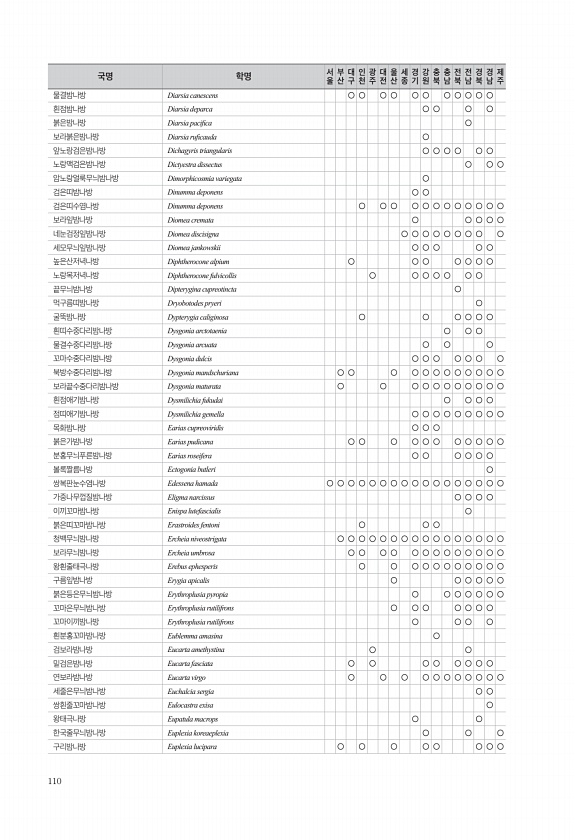110 물결밤나방 Diarsia canescens ○ ○ ○ ○ ○ ○ ○ ○ ○ ○ ○ 흰점밤나방 Diarsia deparca ○ ○ ○ ○ 붉은밤나방 Diarsia pacifca ○ 보라붉은밤나방 Diarsia rufcauda ○ 앞노랑검은밤나방 Dichagyris triangularis ○ ○ ○ ○ ○ ○ 노랑맥검은밤나방 Dictyestra dissectus ○ ○ ○ 암노랑얼룩무늬밤나방 Dimorphicosmia variegata ○ 검은띠밤나방 Dinumma deponens ○ ○ 검은띠수염나방 Dinumma deponens ○ ○ ○ ○ ○ ○ ○ ○ ○ ○ ○ ○ 보라잎밤나방 Diomea cremata ○ ○ ○ ○ ○ 네눈검정잎밤나방 Diomea discisigna ○ ○ ○ ○ ○ ○ ○ ...