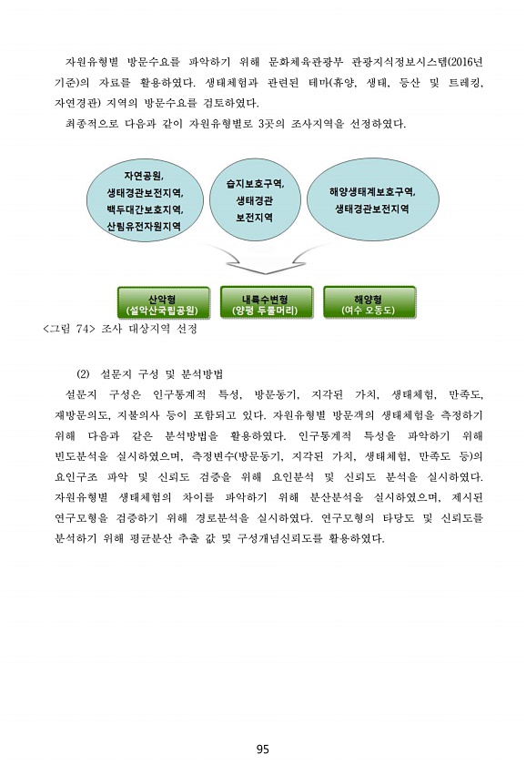 95 자원유형별 방문수요를 파악하기 위해 문화체육관광부 관광지식정보시스템 2016년 기준 의 자료를 활용하였다. 생태체험과 관련된 테마 휴양, 생태, 등산 및 트레킹, 자연경관 지역의 방문수요를 검토하였다. 최종적으로 다음과 같이 자원유형별로 3곳의 조사지역을 선정하였다. 그림 74 조사 대상지역 선정 2 설문지 구성 및 분석방법 설문지 구성은 인구통계적 특성, 방문동기, 지각된 가치, 생태체험, 만족도, 재방문의도, 지불의사 등이 포함되고 있다. 자원유형별 방문객의 생태체험을 측정하기 위해 다음과 같은 분석방법을 활용하였다. 인구통계적 특성을 파악하기 위해 빈도분석을 실시하였으며, 측정변수 방문동기, 지각된 가치, 생태체험, 만족도 등 의 요인구조 파악 및 신뢰도 검증을 위해 요인분석 및 신뢰도 분석을 실...