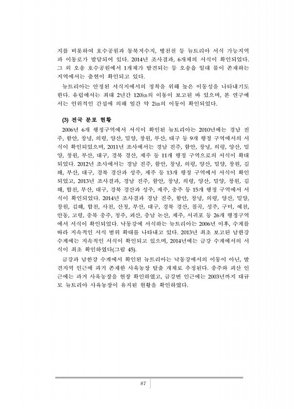 87 지를 비롯하여 호수공원과 동북저수지, 병천천 등 뉴트리아 서식 가능지역 과 이동로가 발달되어 있다. 2014년 조사결과, 6개체의 서식이 확인되었다. 그 외 오송 호수공원에서 1개체가 발견되는 등 오송읍 일대 물이 존재하는 지역에서는 출현이 확인되고 있다. 뉴트리아는 안정된 서식지에서의 정착을 위해 높은 이동성을 나타내기도 한다. 유럽에서는 최대 2년간 120㎞의 이동이 보고된 바 있으며, 본 연구에 서는 인위적인 간섭에 의해 일간 약 2㎞의 이동이 확인되었다. 3 전국 분포 현황 2006년 6개 행정구역에서 서식이 확인된 뉴트리아는 2010년에는 경남 진 주, 함안, 창녕, 의령, 양산, 밀양, 창원, 부산, 대구 등 9개 행정 구역에서의 서 식이 확인되었으며, 2011년 조사에서는 경남 진주, 함안...