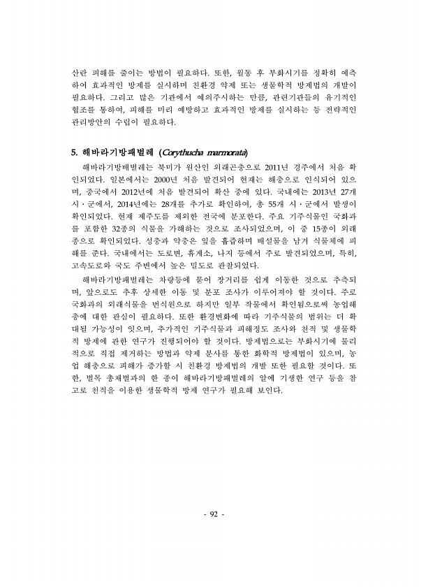 92 산란 피해를 줄이는 방법이 필요하다. 또한, 월동 후 부화시기를 정확히 예측 하여 효과적인 방제를 실시하며 친환경 약제 또는 생물학적 방제법의 개발이 필요하다. 그리고 많은 기관에서 예의주시하는 만큼, 관련기관들의 유기적인 협조를 통하여, 피해를 미리 예방하고 효과적인 방제를 실시하는 등 전략적인 관리방안의 수립이 필요하다. 5. 해바라기방패벌레 Corythucha marmorata 해바라기방배벌레는 북미가 원산인 외래곤충으로 2011년 경주에서 처음 확 인되었다. 일본에서는 2000년 처음 발견되어 현재는 해충으로 인식되어 있으 며, 중국에서 2012년에 처음 발견되어 확산 중에 있다. 국내에는 2013년 27개 시?군에서, 2014년에는 28개를 추가로 확인하여, 총 55개 시?군에서 발생이 확인되...