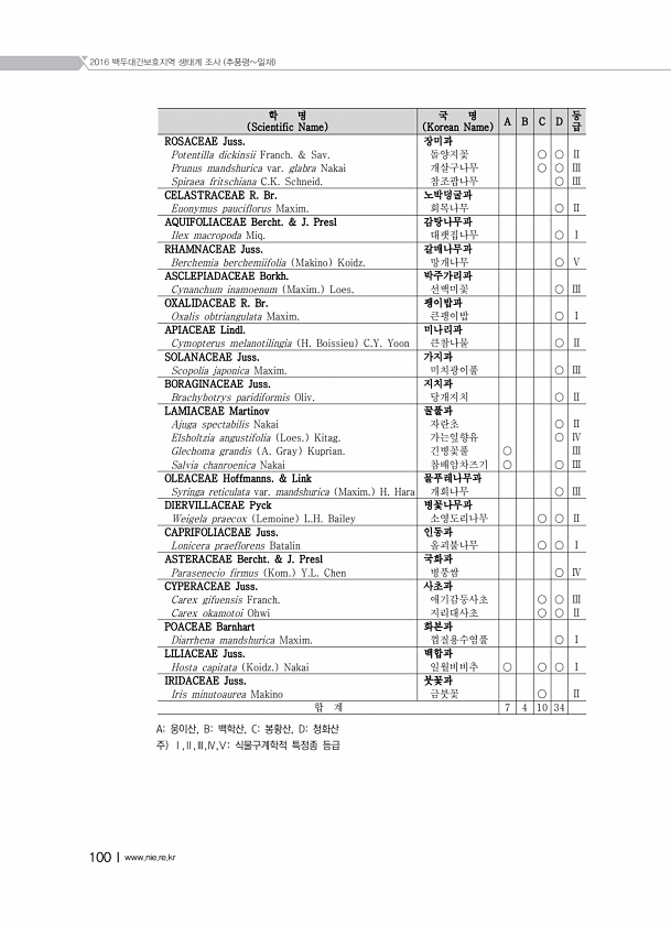 2016 백두대간보호지역 생태계 조사 추풍령밀재 100Ⅰwww.nie.re.kr 학 명 Scientific Name 국 명 Korean Name A B C D 등 급 ROSACEAE Juss. 장미과 Potentilla dickinsii Franch. & Sav. 돌양지꽃 ○ ○ Ⅱ Prunus mandshurica var. glabra Nakai 개살구나무 ○ ○ Ⅲ Spiraea fritschiana C.K. Schneid. 참조팝나무 ○ Ⅲ CELASTRACEAE R. Br. 노박덩굴과 Euonymus pauciflorus Maxim. 회목나무 ○ Ⅱ AQUIFOLIACEAE Bercht. & J. Presl 감탕나무과 Ilex macropoda Miq. 대팻집나무 ○ Ⅰ RHAMNACEAE Juss....