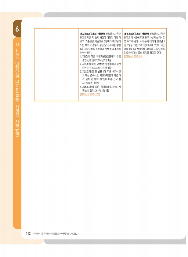6 112 _ 환경부 유전자변형생물체 안전관리 가이드 1 L M O 법령단위 비교표 법률- 시행령- 시행규칙 제32조의3 규제의 재검토 산업통상자원부 장관은 다음 각 호의 사항에 대하여 다음 각 호의 기준일을 기준으로 3년마다 매 3년이 되는 해의 기준일과 같은 날 전까지를 말한 다 그 타당성을 검토하여 개선 등의 조치를 하여야 한다. 1. 제5조에 따른 유전자변형생물체의 수입 승인 신청 절차2014년 1월 1일 2. 제13조에 따른 유전자변형생물체의 생산 승인 신청 절차2014년 1월 1일 3. 제23조제1항 및 별표 1에 따른 허가ㆍ신 고 대상 연구시설, 제23조제3항에 따른 허 가 절차 및 제23조제5항에 따른 신고 절 차2014년 1월 1일 4. 제26조의2에 따른 위해성평가기관의 지 정 신청 절차2...