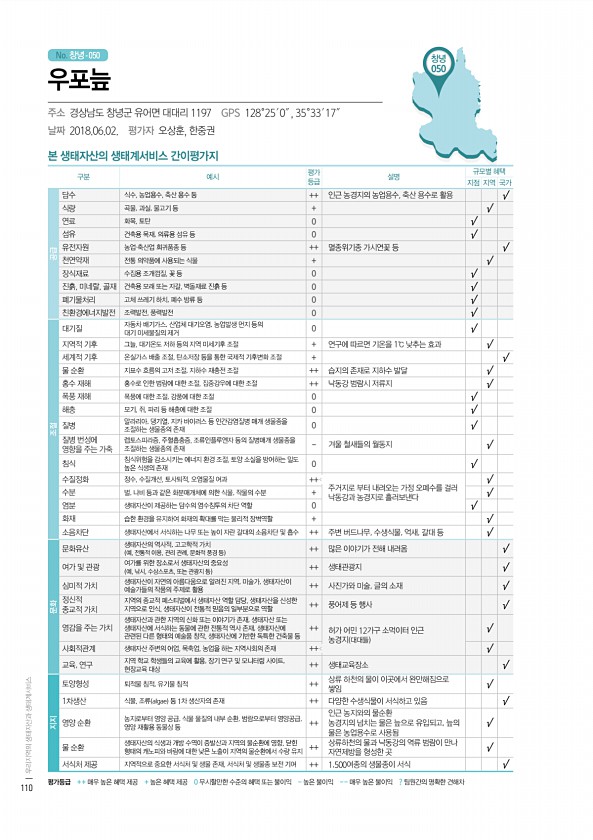 No. 창녕- 창녕 050 본 생태자산의 생태계서비스 간이평가지 구분 예시 평가 등급 설명 규모별 혜택 지점 지역 국가 공급 담수 식수, 농업용수, 축산 용수 등 ++ 인근 농경지의 농업용수, 축산 용수로 활용 √ 식량 곡물, 과실, 물고기 등 + √ 연료 화목, 토탄 0 √ 섬유 건축용 목재, 의류용 섬유 등 0 √ 유전자원 농업·축산업 희귀품종 등 ++ 멸종위기종 가시연꽃 등 √ 천연약재 전통 의약품에 사용되는 식물 + √ 장식재료 수집용 조개껍질, 꽃 등 0 √ 진흙, 미네랄, 골재 건축용 모래 또는 자갈, 벽돌재료 진흙 등 0 √ 폐기물처리 고체 쓰레기 하치, 폐수 방류 등 0 √ 친환경에너지발전 조력발전, 풍력발전 0 √ 조절 대기질 자동차 배기가스, 산업체 대기오염, 농업발생 먼지 등의 대기 미세...
