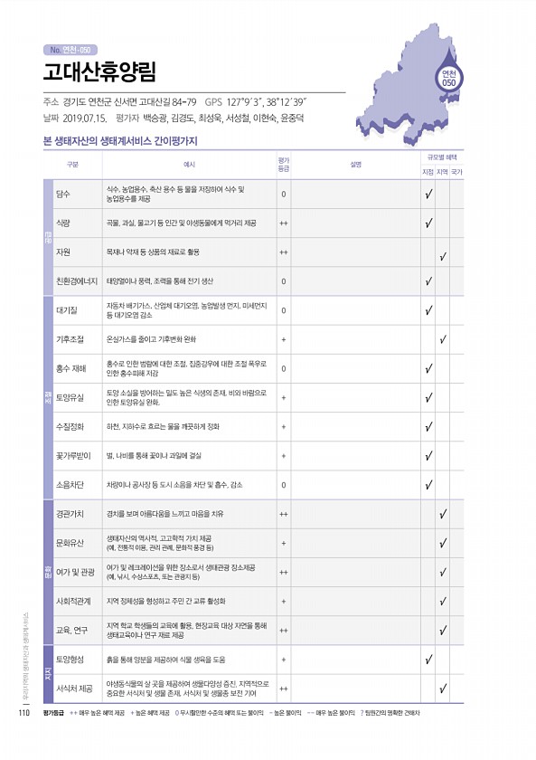 No. 연천- 연천 050 본 생태자산의 생태계서비스 간이평가지 구분 예시 평가 등급 설명 규모별 혜택 지점 지역 국가 공급 담수 식수, 농업용수, 축산 용수 등 물을 저장하여 식수 및 농업용수를 제공 0 √ 식량 곡물, 과실, 물고기 등 인간 및 야생동물에게 먹거리 제공 ++ √ 자원 목재나 약재 등 상품의 재료로 활용 ++ √ 친환경에너지 태양열이나 풍력, 조력을 통해 전기 생산 0 √ 조절 대기질 자동차 배기가스, 산업체 대기오염, 농업발생 먼지, 미세먼지 등 대기오염 감소 0 √ 기후조절 온실가스를 줄이고 기후변화 완화 + √ 홍수 재해 홍수로 인한 범람에 대한 조절, 집중강우에 대한 조절 폭우로 인한 홍수피해 저감 0 √ 토양유실 토양 소실을 방어하는 밀도 높은 식생의 존재, 비와 바람으로 인한 토...