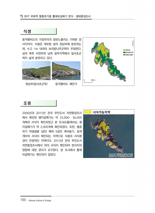 2017 국제적 멸종위기종 뿔제비갈매기 번식·생태환경조사 100 ? National Institute of Ecology 식생 동격렬비도의 가장자리의 암반노출지는 가파른 경 사지이다. 식생은 대부분 섬의 정상부에 분포하는 데, 수고 1m 내외의 보리밥나무군락이 우점한다. 섬의 북측 사면부와 남측 일부지역에서 밀사초군 락이 넓게 분포하고 있다. 정상부 밀사초군락 동격렬비도 해안가 조류 2006년과 2015년 전국 무인도서 자연환경조사 에서 확인된 괭이갈매기는 약 25,00034,000 개체의 서식이 확인되었고 본 조사 6월 에서는 괭 이갈매기가 약 2,000개체 확인되었다. 또한, 멸종 위기 야생생물 I급인 매와 II급인 흑비둘기, 섬개 개비의 서식이 확인되는 지역으로 식생과 서식환 경이 안정적인 지역이다. ...