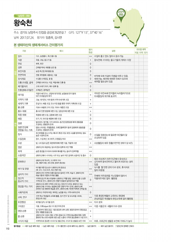No. 남양주 남양주 050 본 생태자산의 생태계서비스 간이평가지 구분 예시 평가 등급 설명 규모별 혜택 지점 지역 국가 공급 담수 식수, 농업용수, 축산 용수 등 ++ 수질이 좋고 양도 많아서 용수가능 식량 곡물, 과실, 물고기 등 + 왕숙천에 서식하는 물고기들의 개체수 다양 연료 화목, 토탄 0 섬유 건축용 목재, 의류용 섬유 등 0 유전자원 농업·축산업 희귀품종 등 0 천연약재 전통 의약품에 사용되는 식물 0 바닥에 모래 자갈이 주층을 이루고 있음, 채취가능, 예전에 채취한 전례가 있으며 채취할 필요성이 있음 장식재료 수집용 조개껍질, 꽃 등 0 진흙,미네랄, 골재 건축용 모래 또는 자갈, 벽돌재료 진흙 등 ++ 폐기물처리 고체 쓰레기 하치, 폐수 방류 등 0 친환경에너지발전 조력발전, 풍력발전 0 조...