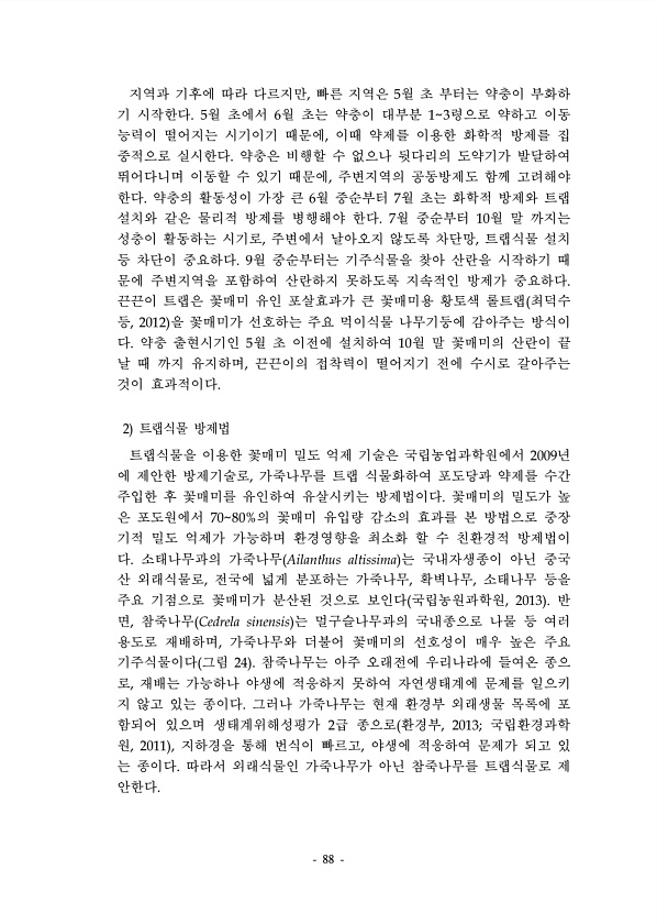 88 지역과 기후에 따라 다르지만, 빠른 지역은 5월 초 부터는 약충이 부화하 기 시작한다. 5월 초에서 6월 초는 약충이 대부분 13령으로 약하고 이동 능력이 떨어지는 시기이기 때문에, 이때 약제를 이용한 화학적 방제를 집 중적으로 실시한다. 약충은 비행할 수 없으나 뒷다리의 도약기가 발달하여 뛰어다니며 이동할 수 있기 때문에, 주변지역의 공동방제도 함께 고려해야 한다. 약충의 활동성이 가장 큰 6월 중순부터 7월 초는 화학적 방제와 트랩 설치와 같은 물리적 방제를 병행해야 한다. 7월 중순부터 10월 말 까지는 성충이 활동하는 시기로, 주변에서 날아오지 않도록 차단망, 트랩식물 설치 등 차단이 중요하다. 9월 중순부터는 기주식물을 찾아 산란을 시작하기 때 문에 주변지역을 포함하여 산란하지 못하도록 지속적...