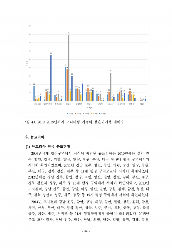 84 그림 43. 20102018년까지 모니터링 지점의 붉은귀거북 개체수 라. 뉴트리아 1 뉴트리아 전국 분포현황 2006년 6개 행정구역에서 서식이 확인된 뉴트리아는 2010년에는 경남 진 주, 함안, 창녕, 의령, 양산, 밀양, 창원, 부산, 대구 등 9개 행정 구역에서의 서식이 확인되었으며, 2011년 경남 진주, 함안, 창녕, 의령, 양산, 밀양, 창원, 부산, 대구, 경북 경산, 제주 등 11개 행정 구역으로의 서식이 확대되었다. 2012년에는 경남 진주, 함안, 창녕, 의령, 양산, 밀양, 창원, 김해, 부산, 대구, 경북 경산과 성주, 제주 등 13개 행정 구역에서 서식이 확인되었고, 2013년 조사결과, 경남 진주, 함안, 창녕, 의령, 양산, 밀양, 창원, 김해, 합천, 부산, 대 구, 경북...