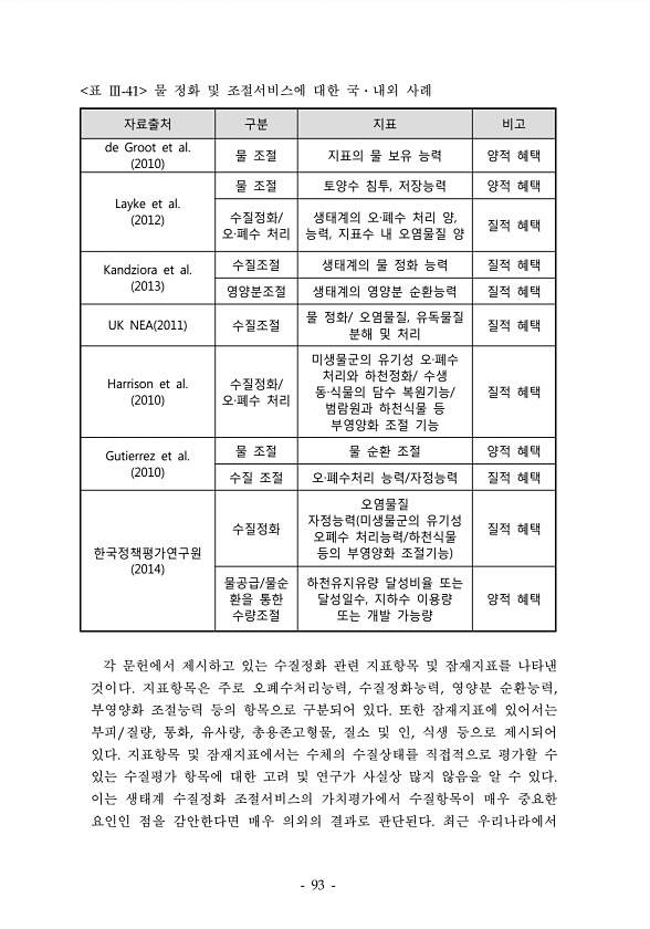 자료출처 구분 지표 비고 de Groot et al. 2010 물 조절 지표의 물 보유 능력 양적 혜택 Layke et al. 2012 물 조절 토양수 침투, 저장능력 양적 혜택 수질정화/ 오·폐수 처리 생태계의 오·폐수 처리 양, 능력, 지표수 내 오염물질 양 질적 혜택 Kandziora et al. 2013 수질조절 생태계의 물 정화 능력 질적 혜택 영양분조절 생태계의 영양분 순환능력 질적 혜택 UK NEA 2011 수질조절 물 정화/ 오염물질, 유독물질 분해 및 처리 질적 혜택 Harrison et al. 2010 수질정화/ 오·폐수 처리 미생물군의 유기성 오·폐수 처리와 하천정화/ 수생 동·식물의 담수 복원기능/ 범람원과 하천식물 등 부영양화 조절 기능 질적 혜택 Gutierrez et al. 201...